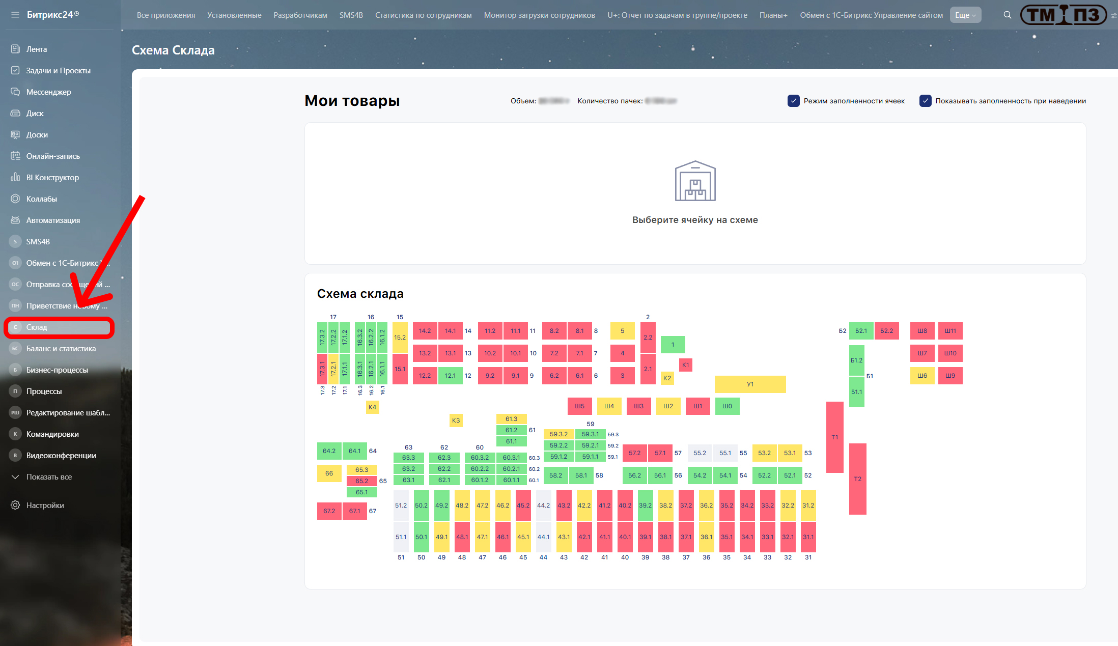 Теперь руководители могут в Битрикс24 в режиме реального времени видеть актуальную заполненность склада.